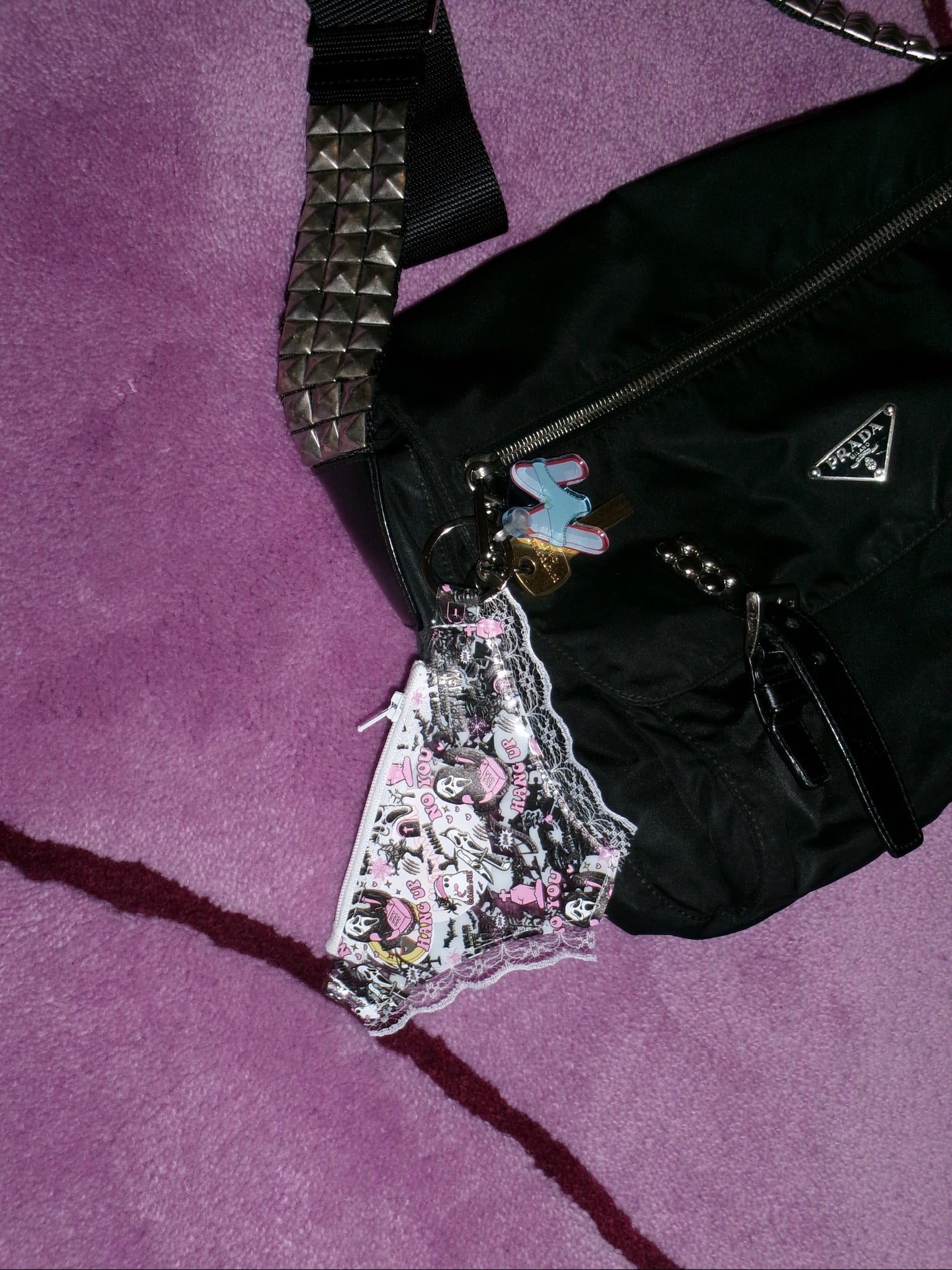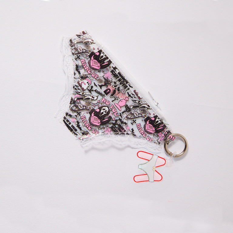 Small pouch shaped like a pair of panties, made from transparent PVC with Ghost prints and white lace edges. It closes with a zipper and includes our Mutandine logo keychain.