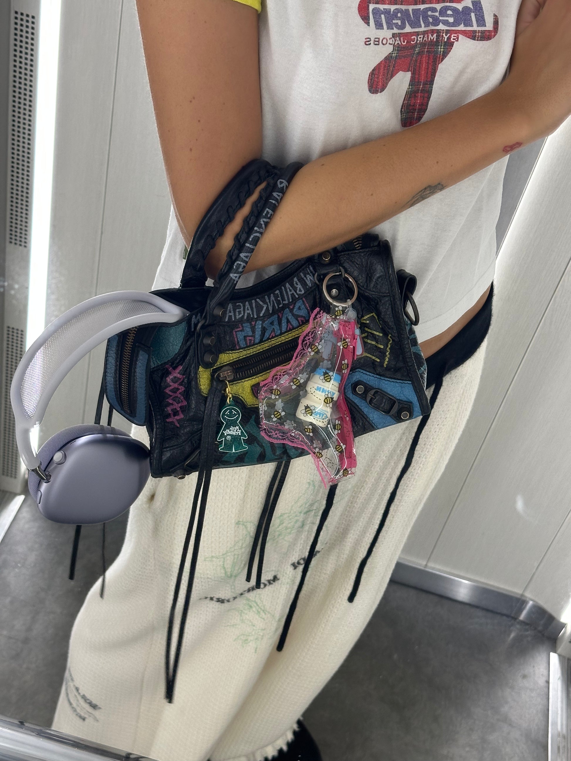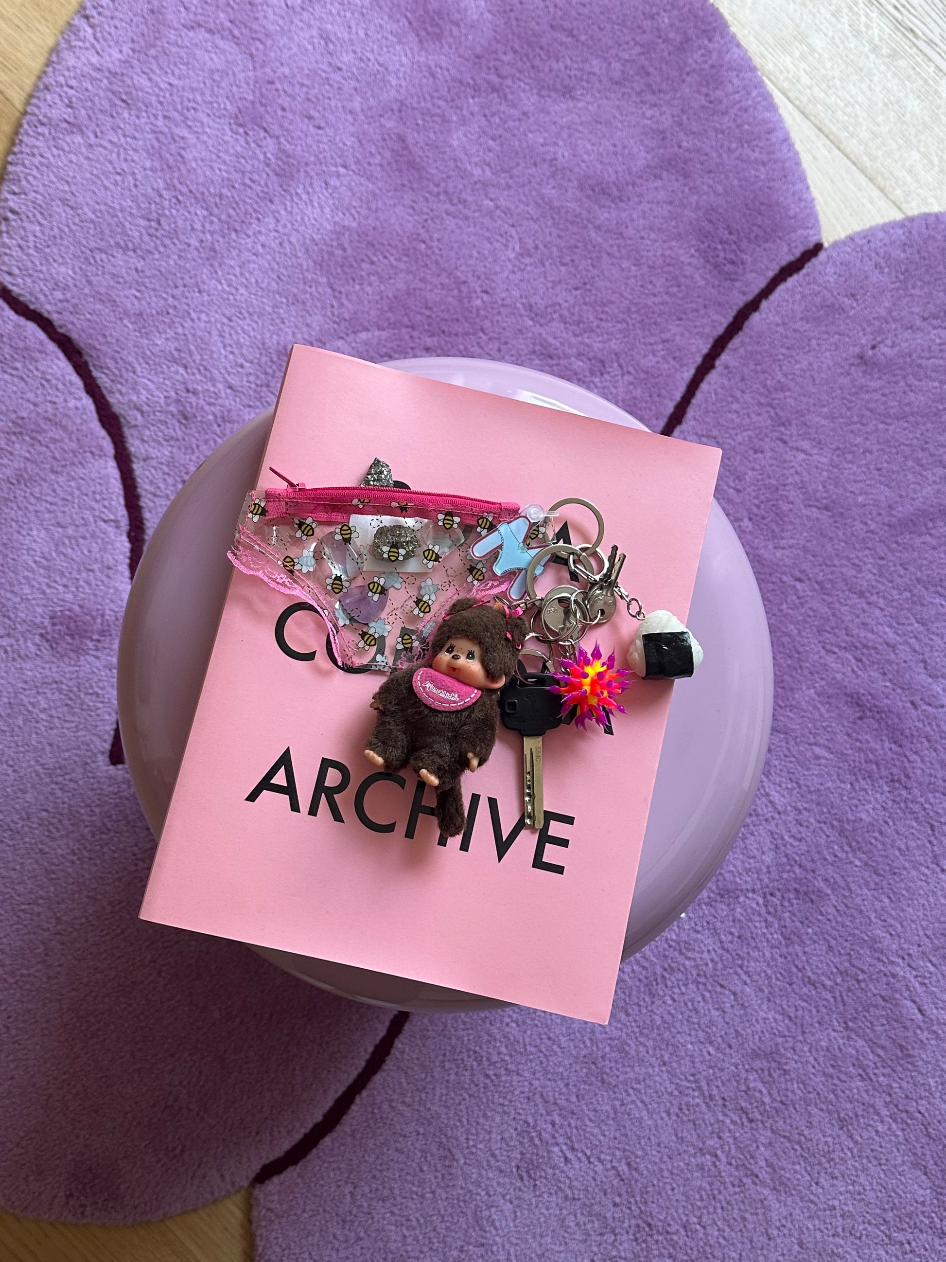 Small pouch shaped like a pair of panties, made from transparent PVC with bees prints and pink lace edges. It closes with a zipper and includes our Mutandine logo keychain.