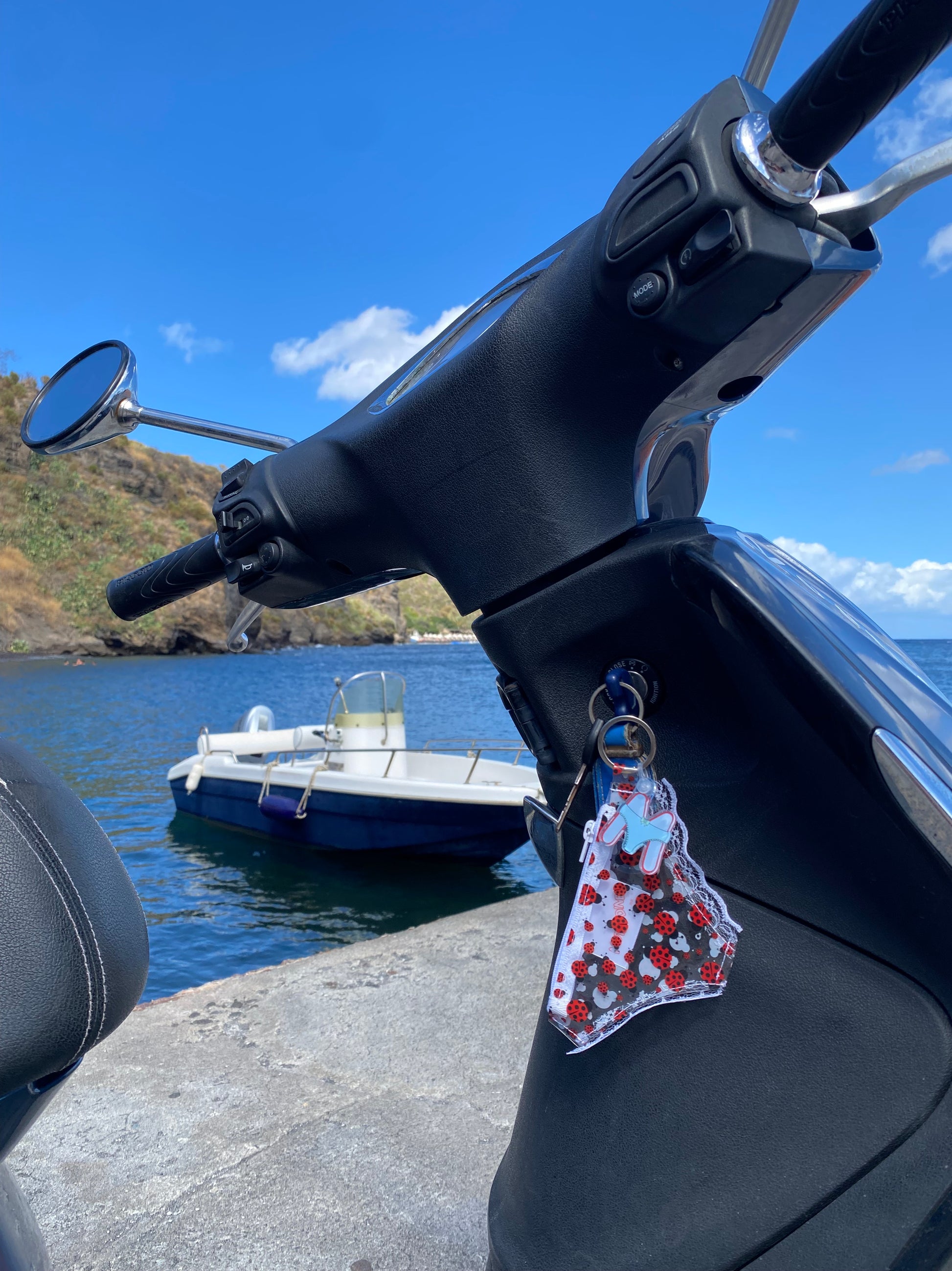 Small pouch shaped like a pair of panties, made from transparent PVC with ladybug prints and white lace edges. It closes with a zipper and includes our Mutandine logo keychain.
